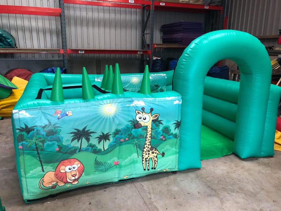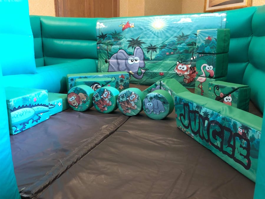 Our Jungle Zone soft play arena offers a self contained space where toddlers of all abilities can have fun. Offering jungle themed soft play shapes, animal rockers such as a Giraffe and Elephant, children will love playing with their favourite animals. In addition to this is a ball pool down one side that has air jugglers on top which allows balls to ‘float’. All our soft play areas come with high quality foam matting inside the surround and commercial size graded balls. As with all our hireable items we offer a quality setup included in the fee. No need to pack away either as we come and collect when you have finished your party.